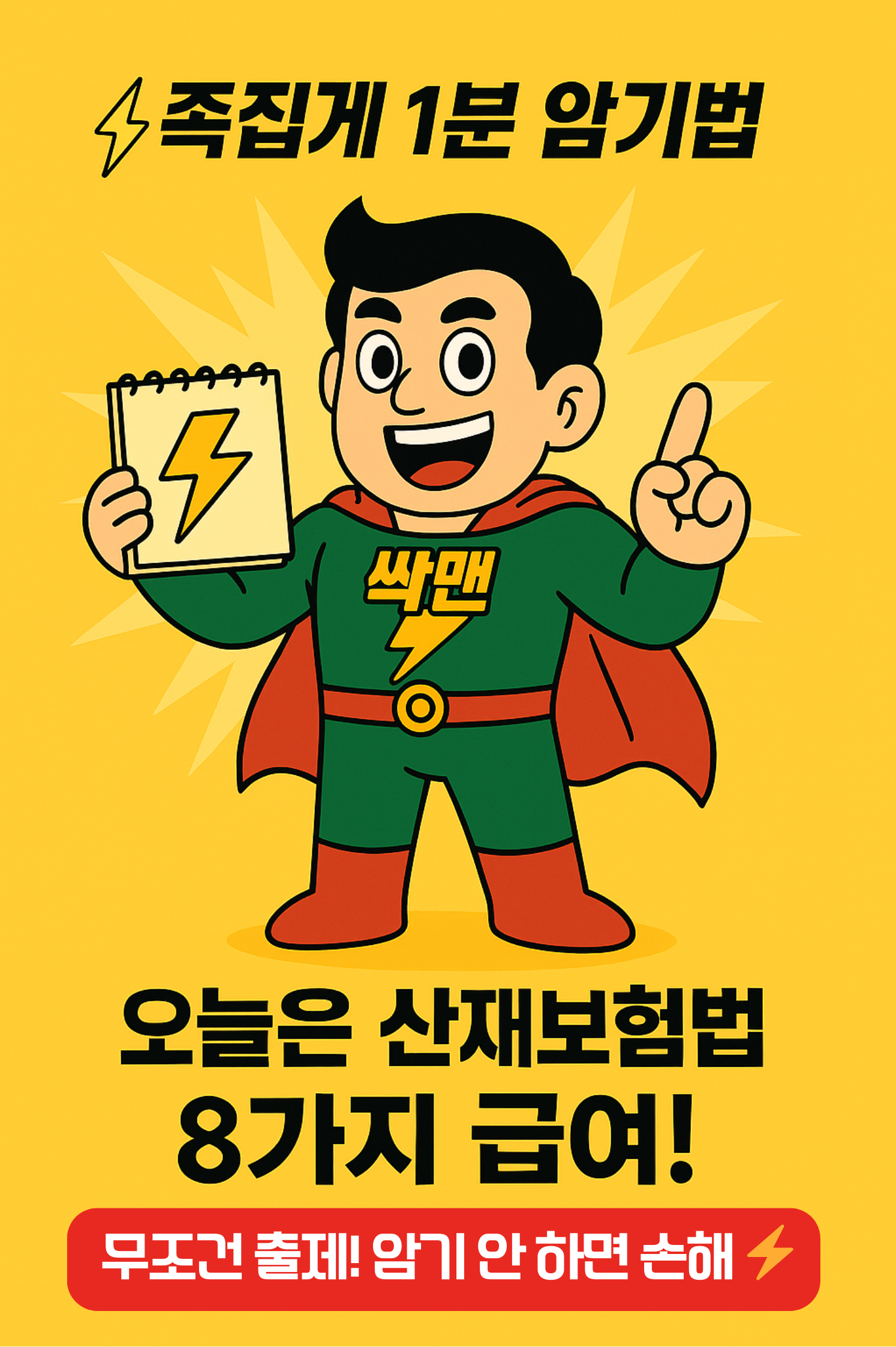 혹시 블로그용으로 제가 대표 썸네일 이미지 문구(예: “⚡ 족집게 1분 암기법 | 산재보험법 8가지 급여 완전정복!”)도 제안해드릴까요?