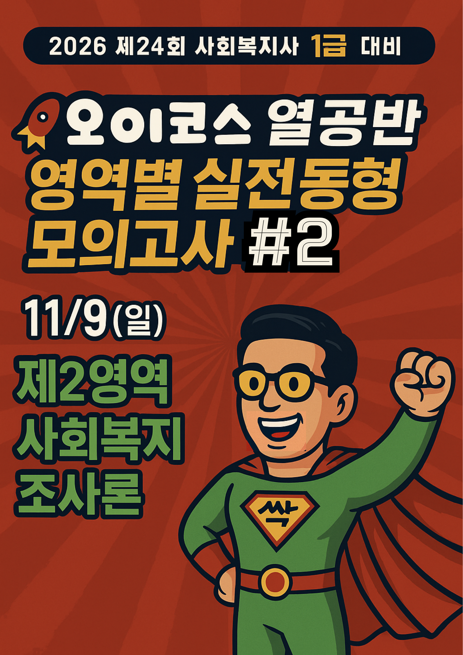 | 📘 2026 제24회 사회복지사 1급 시험공고 기념전국 실력진단 모의고사 LIVE 해설강의 (0) | 2025.10.21 |