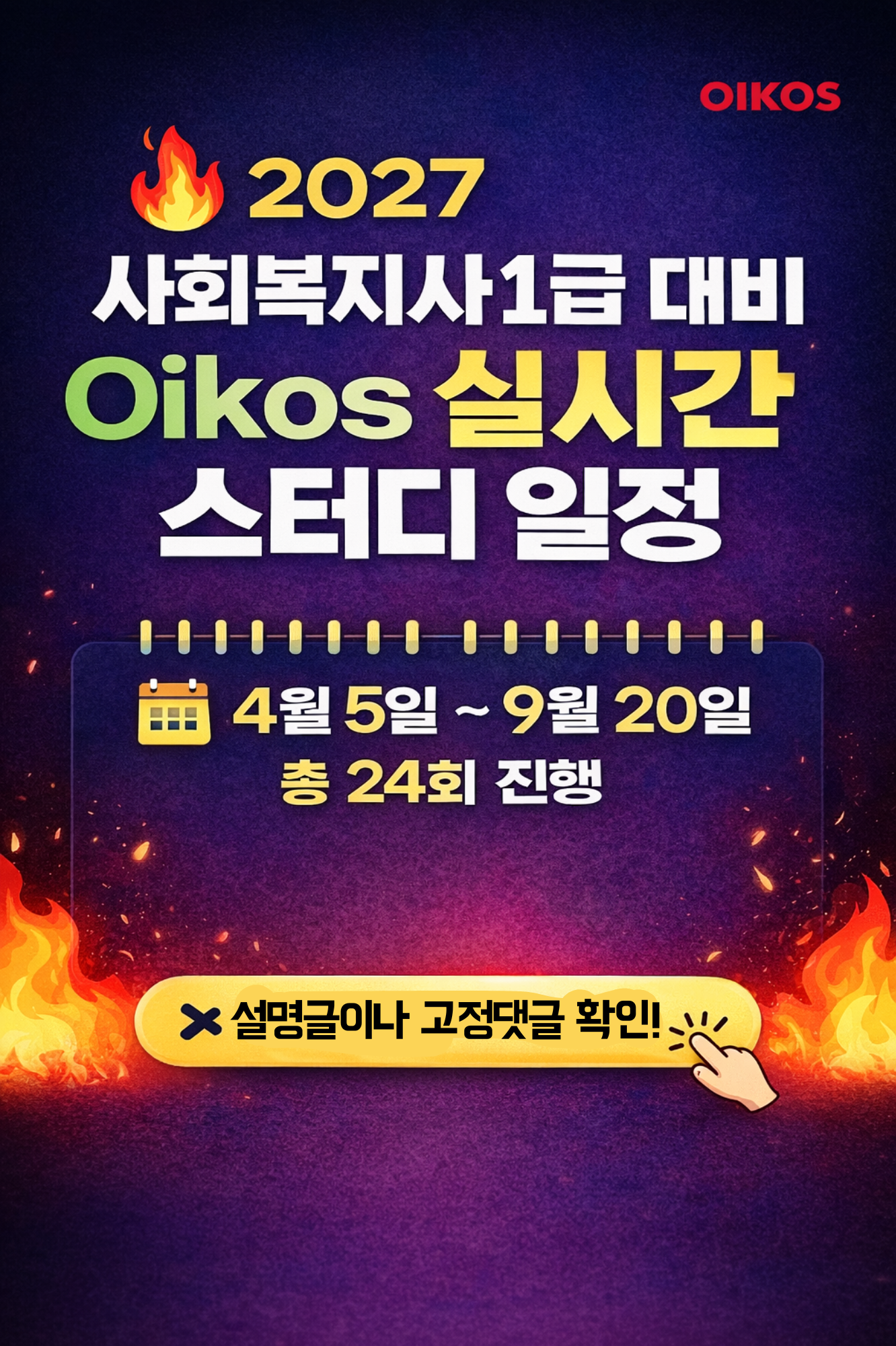 2027년 제25회 사회복지사1급 대비Oikos 스터디 실시간 강의 일정 안내2027년 제25회 사회복지사 1급 시험을 준비하는 분들을 위해김진원 교수가 직접 진도관리하는 Oikos 스터디 실시간 강의 일정을 안내드립니다.혼자 공부하면서 진도 관리가 어려운 수험생이라면체계적으로 끝까지 끌고 가는 학습 환경을 경험하실 수 있습니다.Oikos 스터디 특징✔ 국내 유일 진도관리형 스터디✔ 김진원 교수 직접 밀착관리✔ 진도별 OX · 빵꾸체크 진행✔ 매주 실시간 강의로 학습 점검단순 강의가 아니라👉 진도 관리 + 복습 체크 + 학습 루틴 형성까지 함께 이루어지는 프로그램입니다.강의 진행 방식진행 : ZOOM 실시간 강의시간 : 매주 일요일 밤 9:00 ~ 10:30입장 : 밤 8:40부터 가능전체 일정📅 기..